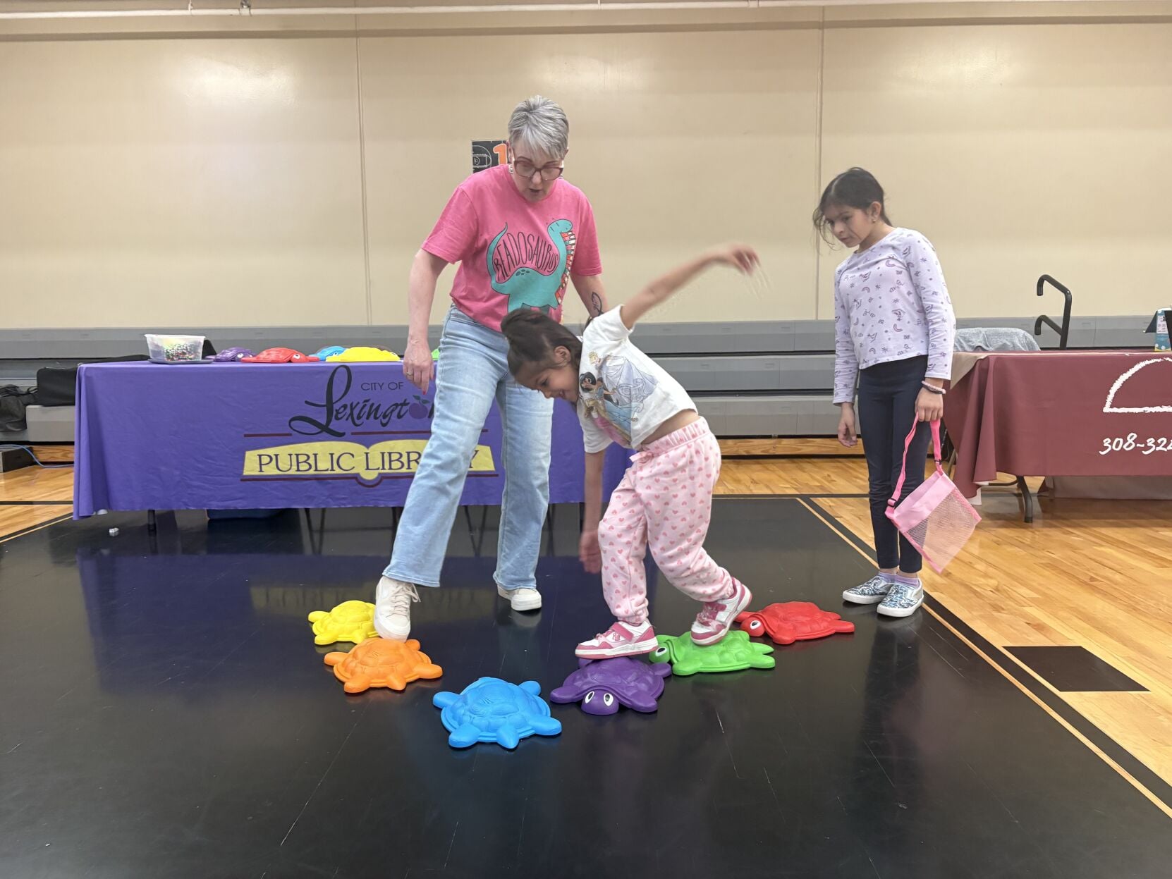Jennifer Norton of Lexington Public Library leads two girls through a colored obstacle course at the library's booth Friday at the Orthman Community YMCA's Healthy Kids Day Friday in Lexington.