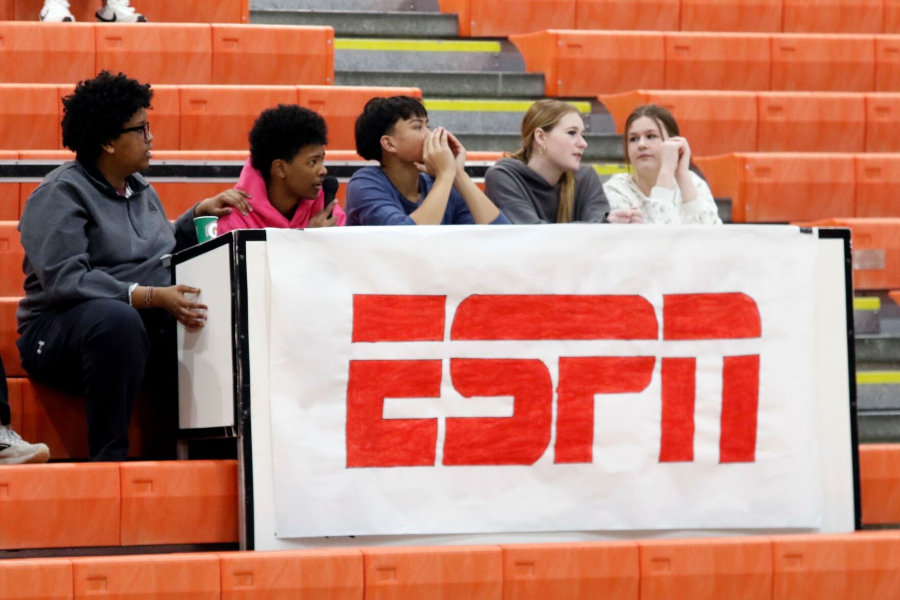 Five Lexington High School students sit behind an ESPN table to